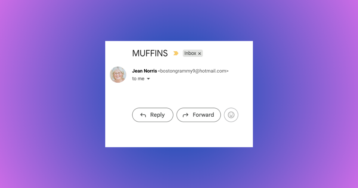 The second email came in immediately after the “Christmas” one, and this time the subject line said, “Muffins.” Now, there’s a few ways we can interpret this. Since it came right after the “Christmas” email, we could assume that the two were actually intended to be part of the same thought, like “Christmas muffins.” As in, Grandma is either making special Christmas muffins, or she wants someone to bring Christmas muffins. Another possibility is that the “Christmas” email was the precursor to a sort of Christmas celebration checklist, with “Muffins” being the first item on the list. Unfortunately, either interpretation still leaves us unclear as to whether Grandma wants someone to bring muffins or is baking the muffins herself. Muffins aren’t really a food normally associated with Christmas, so we don’t know what would constitute a “Christmas muffin” anyway.