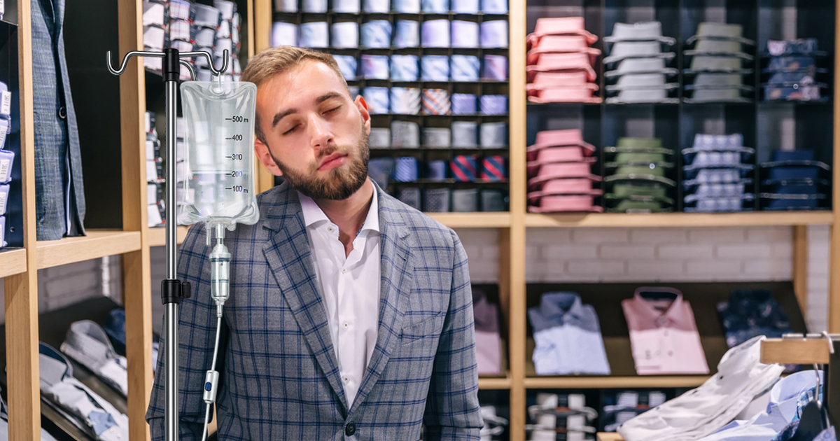 For generations, men have had to suffer through endless suit fittings while fully conscious, experiencing every excruciating second as a tailor dragged tape measures all over their thighs and shoulders. That living nightmare is about to become a thing of the past, however, because starting today, Men’s Wearhouse is now offering their customers an IV drip of general anesthesia that will keep them in a drug-induced state of total unconsciousness while their team of expert tailors measures their dimensions to fit them for their world-class suits.