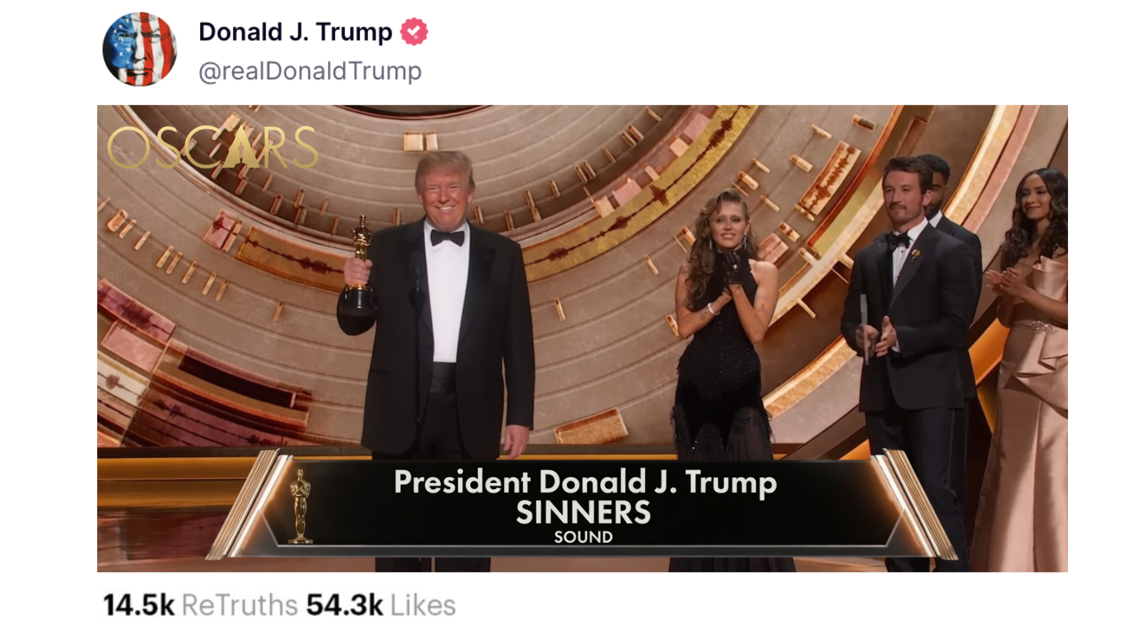Despite the widespread backlash he recently saw for posting an AI-made image of himself as Jesus Christ on Truth Social, President Trump’s megalomania has turned to AI for another recklessly conceited tribute to himself – this time, winning an Academy Award for Best Sound Design for Ryan Coogler’s Sinners, a film that President Trump absolutely did not do the sound design for and that wasn’t even nominated in this category to begin with.