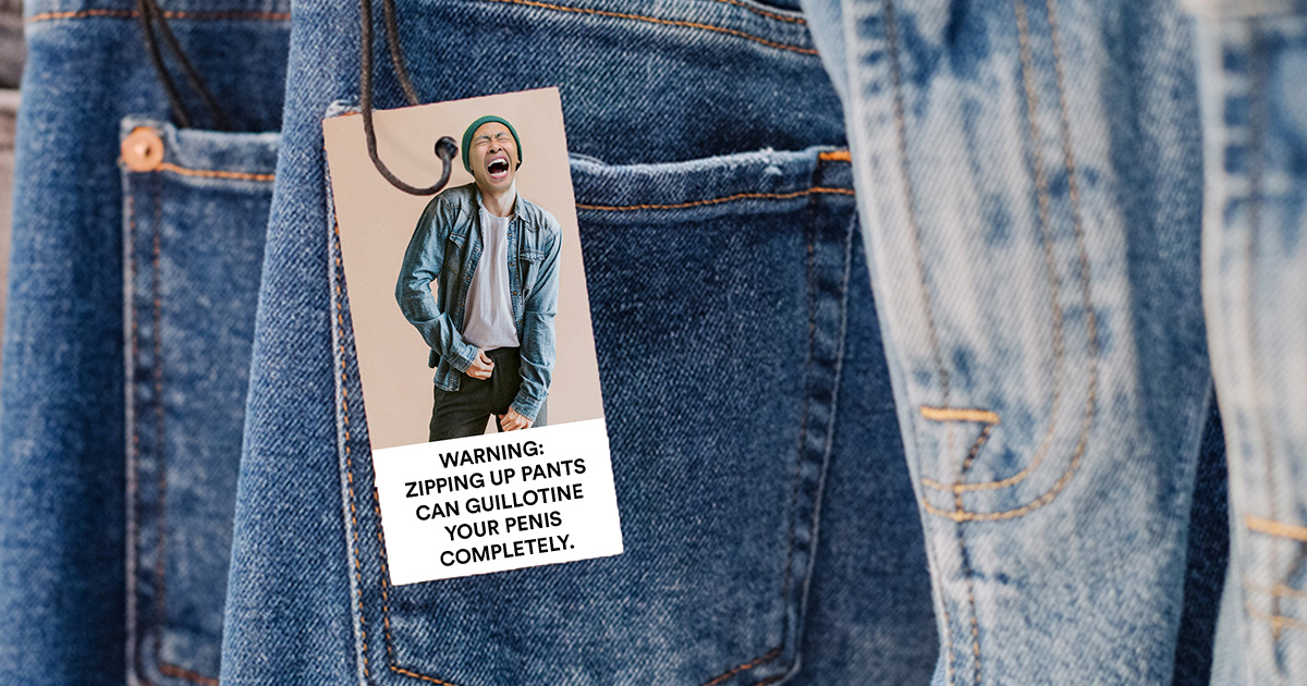 The new warnings are set to go into effect early next month, and are designed to raise awareness among American consumers about the damage even the most innocuous-looking pair of pants can do to a healthy American penis. The warnings will feature a picture of a man screaming in agony as the teeth of a zipper decimates his penis while his devastated family looks on and weeps. A message beneath the picture reads, “Warning: Zipping up pants can guillotine your penis completely.” Now anyone who purchases pants can do so in an informed manner, fully aware that their genitals might get jigsawed up in the process.