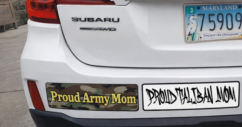 Sibling Rivalry: This Woman’s Subaru Has A Bumper Sticker That Says ‘Proud Army Mom’ And One That Says ‘Proud Taliban Mom’