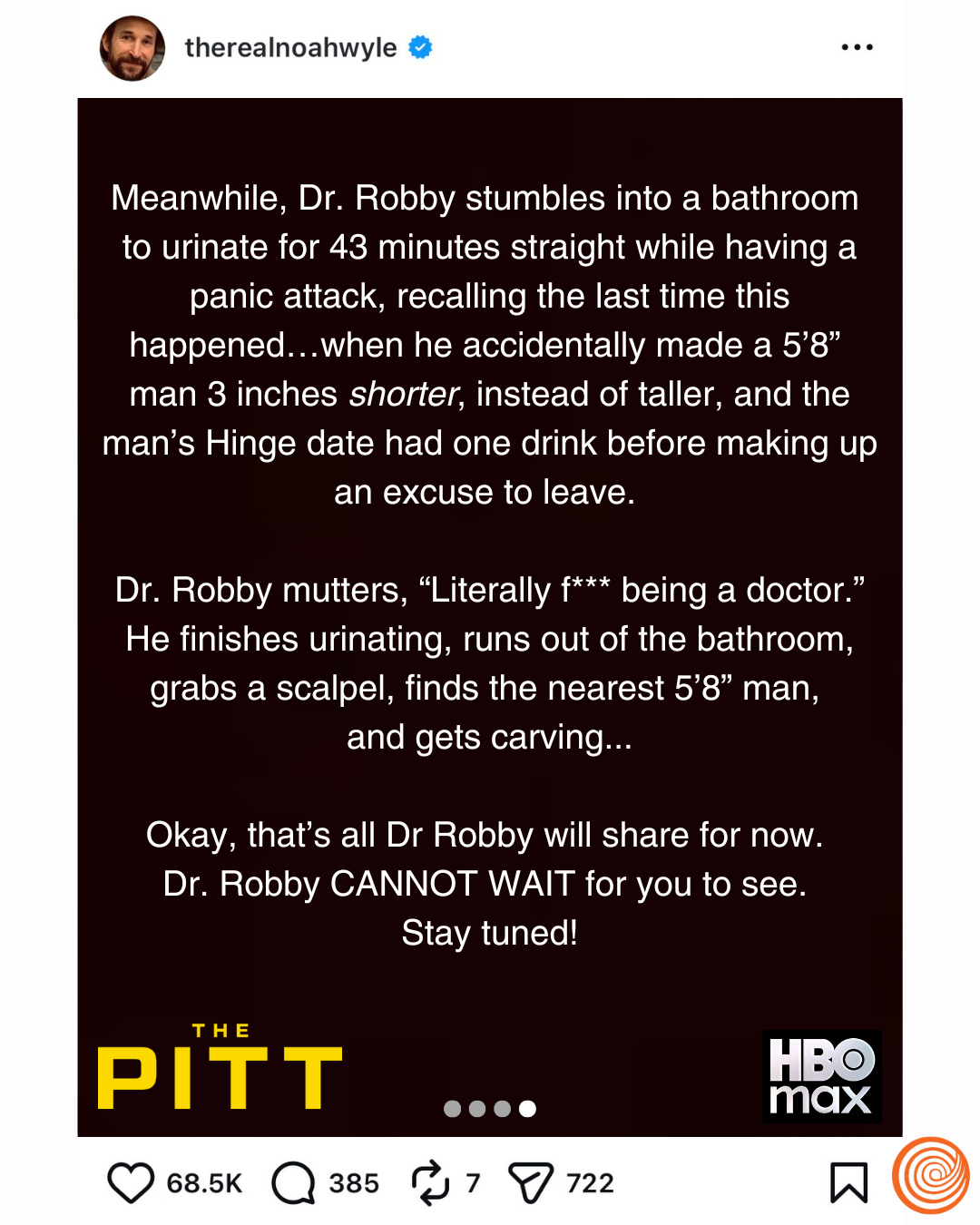 As if The Pitt wasn’t brilliant enough already, its lead actor has confirmed the show’s sophomore season is upping the ante in a way that’s bound to cement its status as the greatest medical drama of all time: Noah Wyle just announced this season will feature the doctors racing against time to give a busload of 5’8” guys emergency leg lengthening surgery.