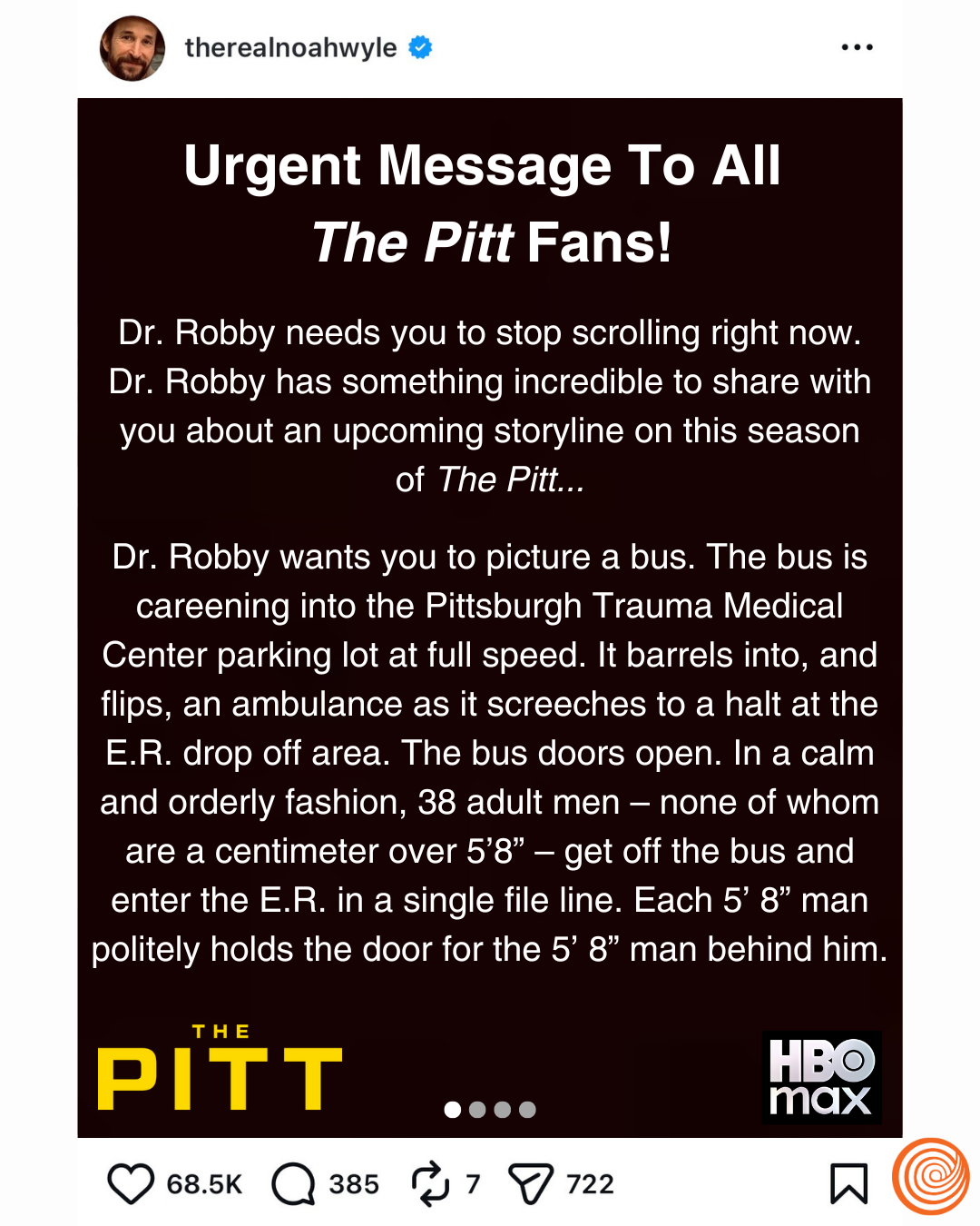 Yesterday, Noah Wyle took to Instagram to reveal that the climax of The Pitt’s second season will see the E.R.’s staff pushed to their limits when a bus arrives at the hospital to drop off over three dozen 5’8” men in need of emergency leg lengthening surgery. Check it out below: