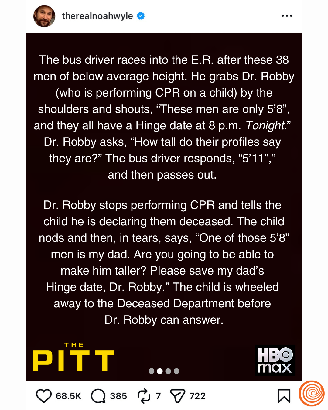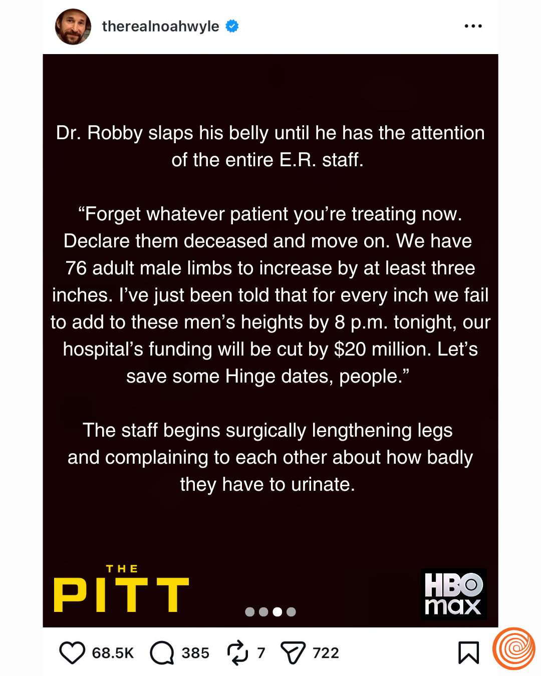 As if The Pitt wasn’t brilliant enough already, its lead actor has confirmed the show’s sophomore season is upping the ante in a way that’s bound to cement its status as the greatest medical drama of all time: Noah Wyle just announced this season will feature the doctors racing against time to give a busload of 5’8” guys emergency leg lengthening surgery.