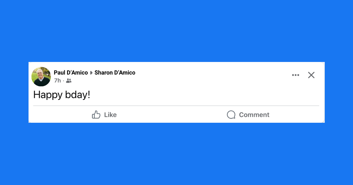 Maybe there’s some reason that Paul thinks he needs to say happy birthday to Sharon on every possible medium, and he wrote the post in addition to texting her “happy birthday,” sending her a “happy birthday” Snapchat, and giving her a thoughtful birthday card. However, it’s still unsettling to see Sharon’s life partner and father of her children write on her Facebook wall like he’s some estranged cousin who only found out it was her birthday because her name was listed under the “Today’s Birthdays” tab.